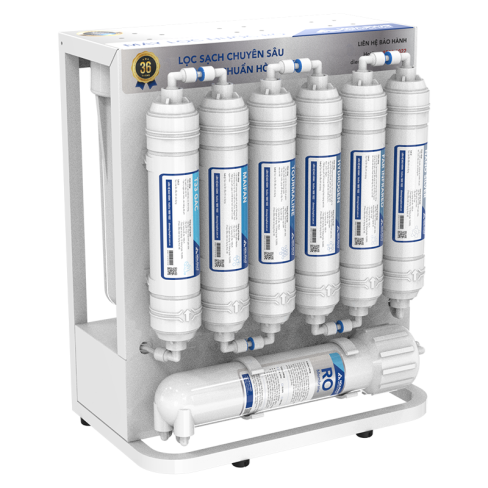 - Lõi PP 5 micron: loại bỏ các tạp chất lớn, cặn bẩn, cát sạn,... có kích thước trên 5 micron trong nước. - Lõi than hoạt tính: khử mùi, chất hữu cơ, thuốc trừ sâu, thuốc bảo vệ thực vật, dư lượng Clo. - Lõi PP 1 micron: loại bỏ cặn bẩn, rêu tảo, các chất rắn có kích thước trên 1 micron trong nước. - Màng lọc RO: giúp loại bỏ 99.99% vi khuẩn, virus, kim loại nặng và hóa chất độc hại, giúp nước trở nên tinh khiết, không màu, không mùi, không vị. - T33 GAC: đào thải chất hữu cơ, khử trùng, lọc sạch màu, mùi. Tạo vị ngọt của nước và cân bằng độ Ph. - Maifan: bổ sung khoáng chất có lợi cho cơ thể như: magie, kali,... Nâng cao Ph giúp cơ thể khỏe hơn. - Tourmaline: tạo ion âm có lợi cho cơ thể, giảm tác nhân có hại trong nước. - Hydrogen: bổ sung hydrogen hoạt hóa. Bổ sung khoáng chất cần thiết: K+, Na+, ZN2+, Ma2+,.... - Far Infrared: các hạt bóng gốm hấp thu năng lượng bên ngoài, phát ra các tia hồng ngoại giúp nước dễ được hoạt hóa, hấp thụ vào cơ thể. - Nano Silver: tiêu diệt vi khuẩn, chống tái nhiễm vi khuẩn khi nước tiếp xúc với không khí. Màng lọc RO 75 GDP Hitech nhập khẩu từ Thái LanMáy lọc nước Hòa Phát HPU456 được trang bị màng lọc RO nhập khẩu từ Thái Lan, mang lại hiệu quả lọc vượt trội và đảm bảo mang lại nguồn nước sạch, an toàn và đạt chuẩn quốc gia về nước uống trực tiếp.